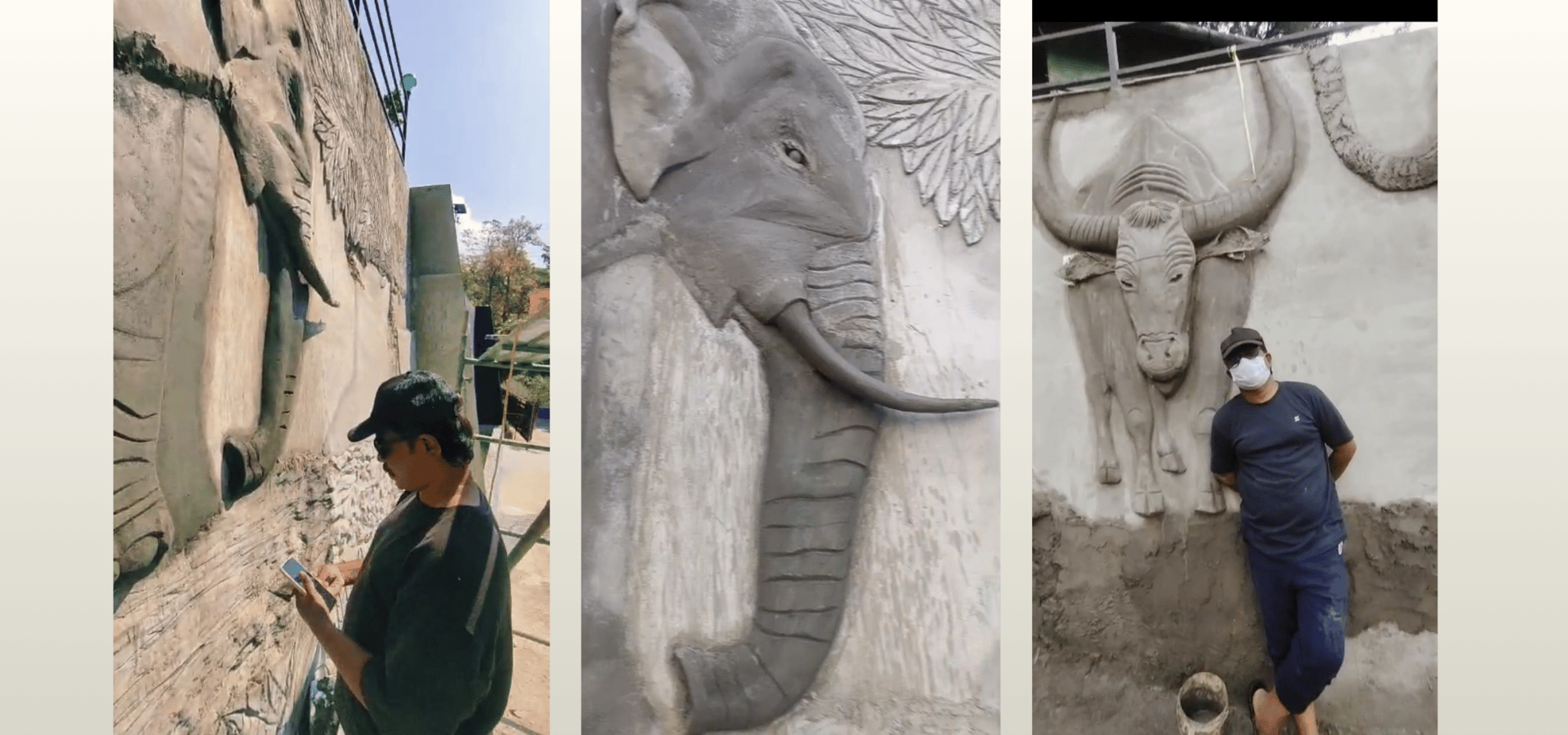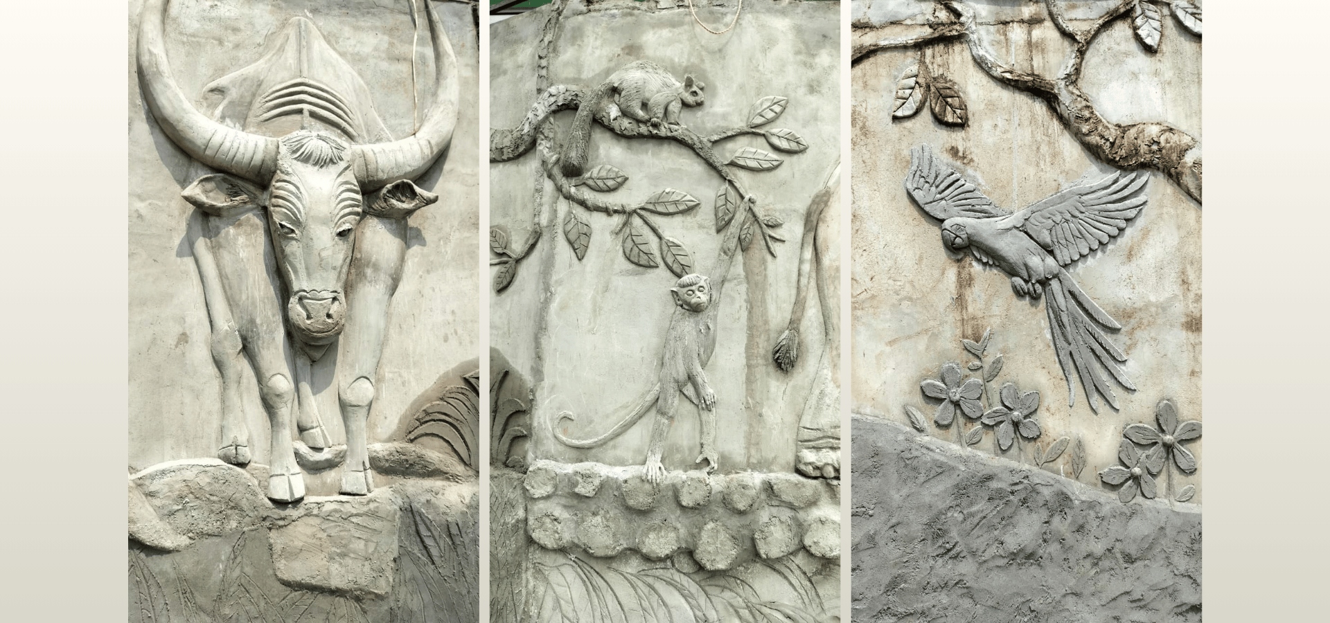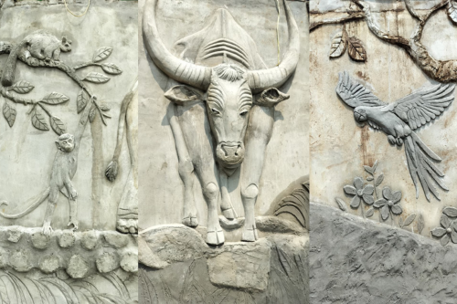 Unique and creative sculptural mural artworks created using cement, ideal for decorative walls and architectural designs.